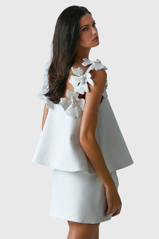 3D Floral Embellished Top and Skirt Two-Piece Set - White