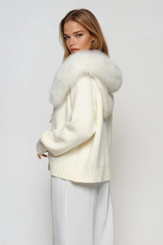 Zip-Up Knit Jacket with Faux Fur Trim - White