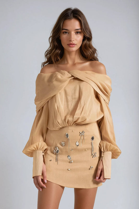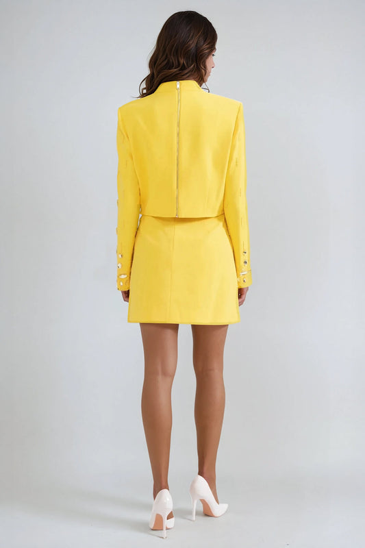 Two-Piece Set with Embellished Long Sleeve Top and Mini Skirt - Yellow