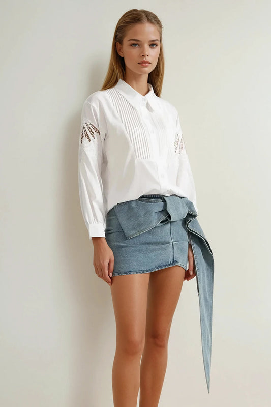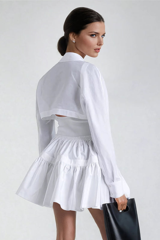Two-Piece Set with Embellished Long Sleeve Top and Mini Skirt - White