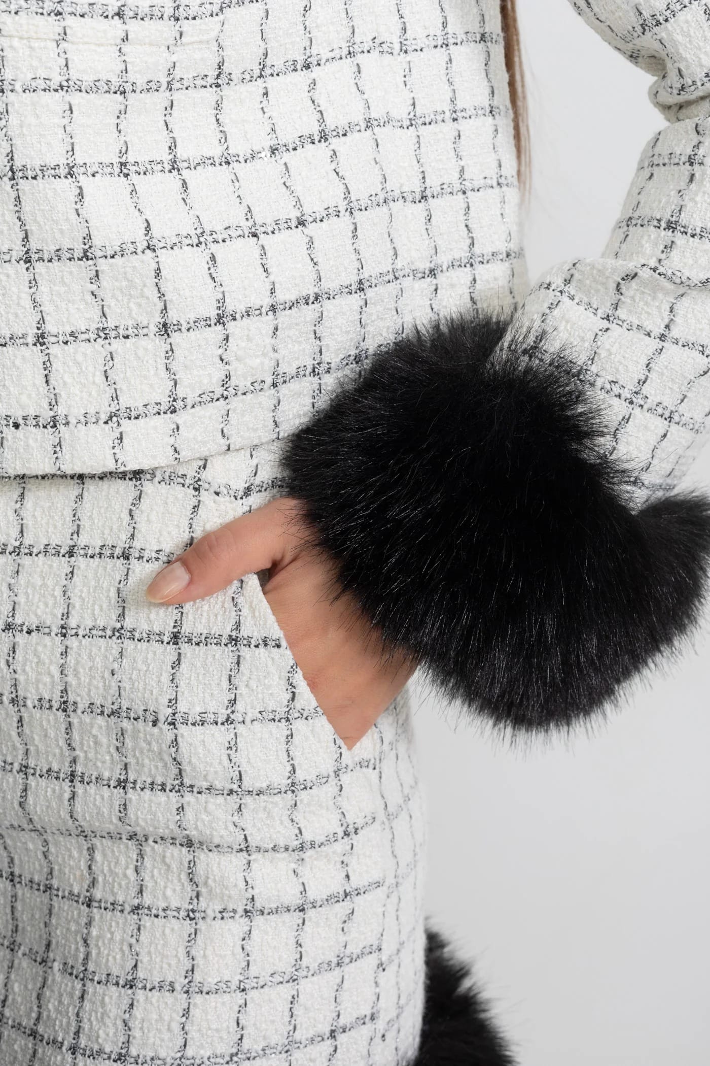 A coordinated set featuring a structured cropped jacket and matching skirt with bold textured trims.